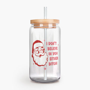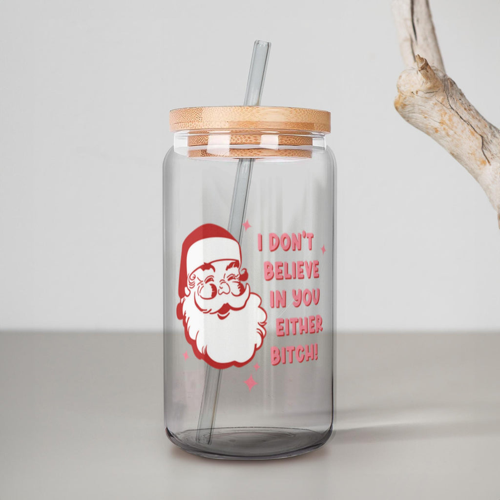 I Don't Believe in You Either Bitch, Funny Gift Exchange Idea, Sarcastic Santa Iced Coffee Cup Rude Holiday Christmas Can Shaped Glass