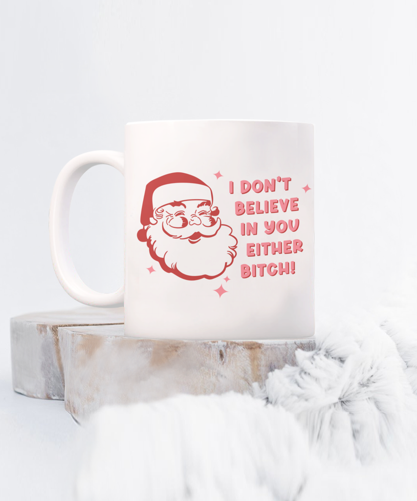Snarky Christmas Mug Gift Exchange Idea I Don't Believe in You Either Bitch Sarcastic Santa Coffee Cup