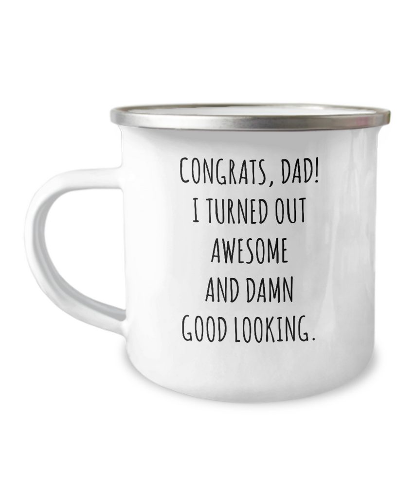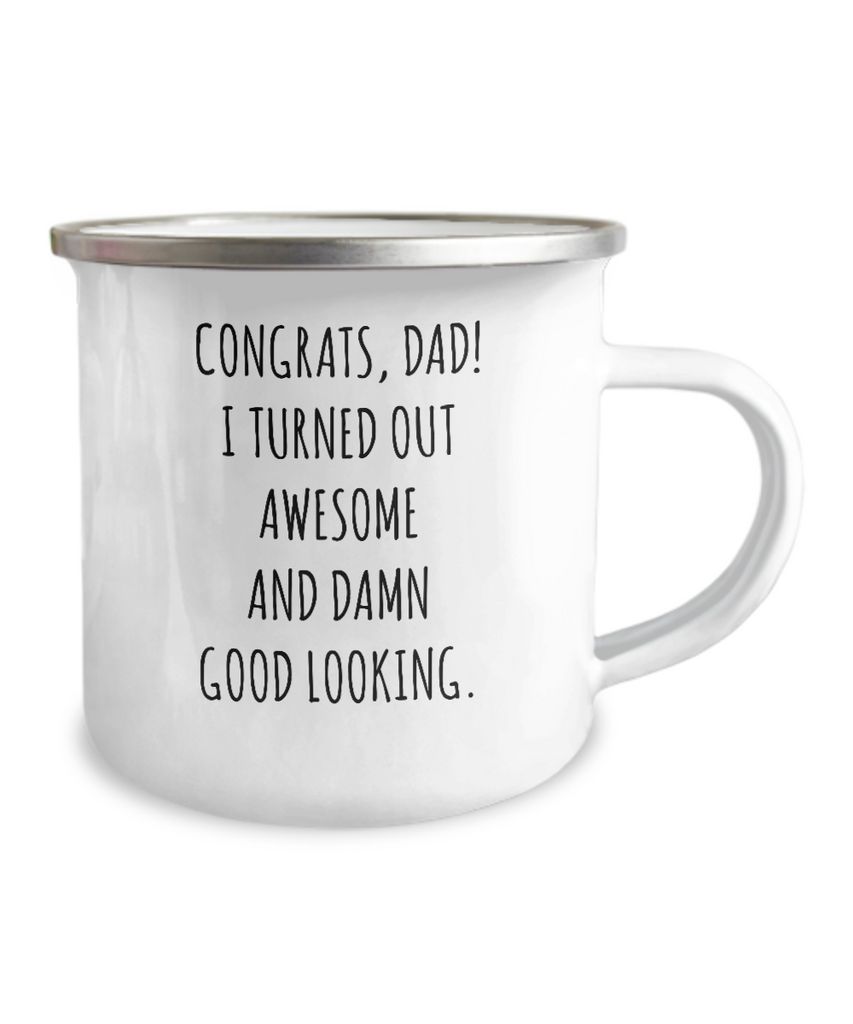 Congrats Dad I Turned Out Awesome And Damn Good Looking Father's Day Metal Camping Mug Coffee Cup Funny Gift