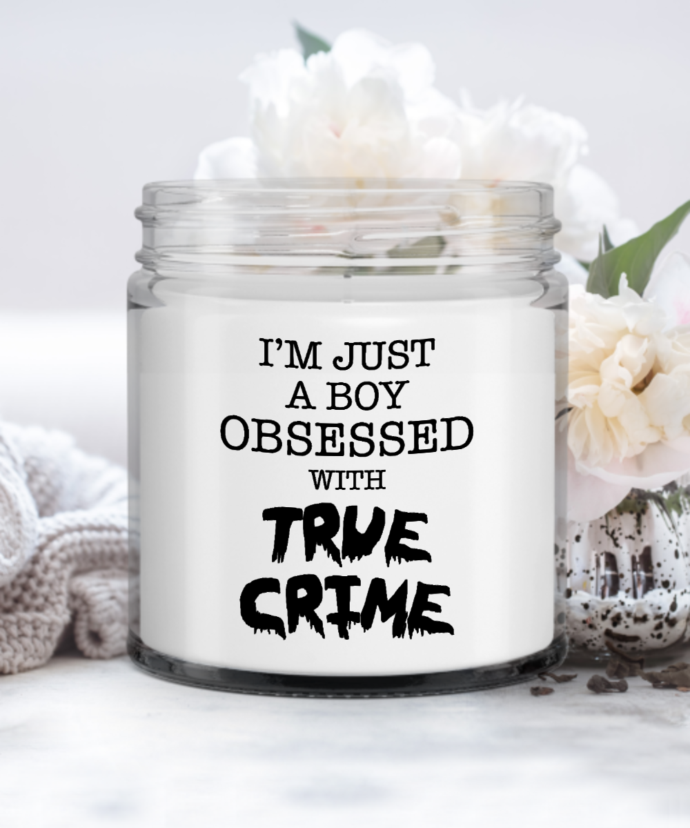 I'm Just A Boy Obsessed With True Crime Candle Vanilla Scented Soy Wax Blend 9 oz. with Lid